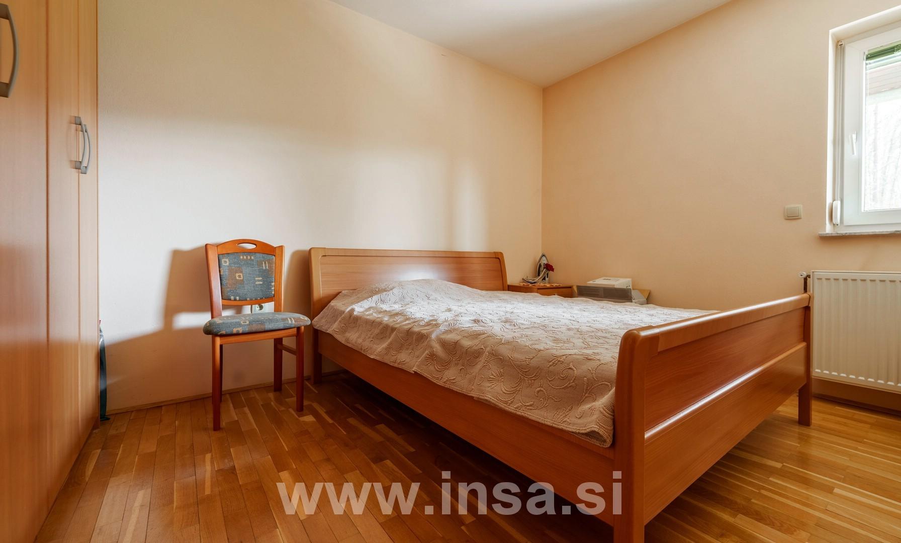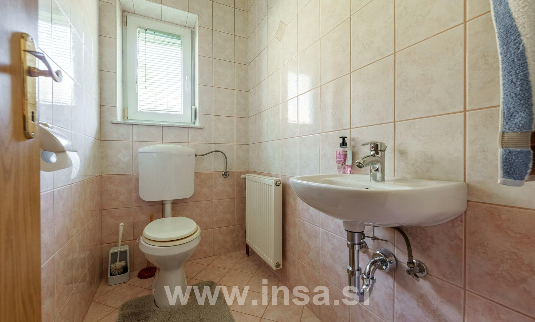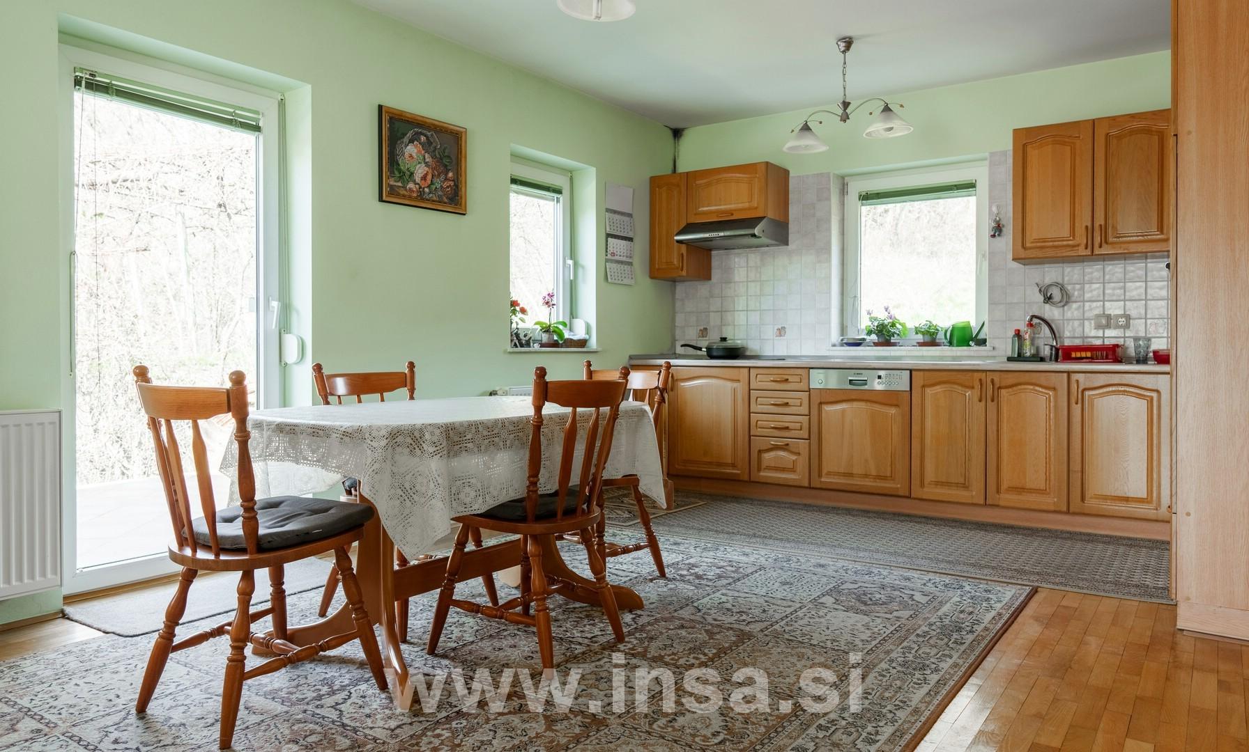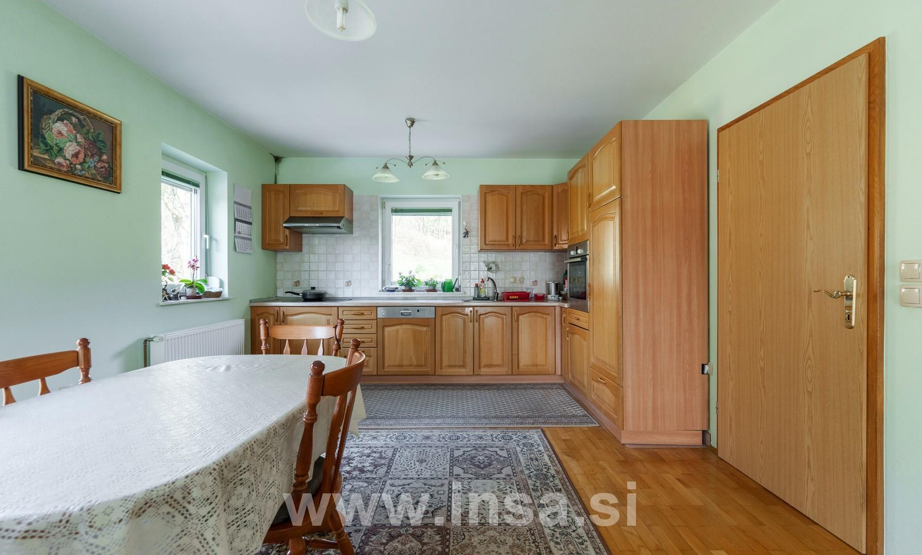 Do pritličja vodi stopnišče, je pa z ločenim vhodom dostopno tudi z zadnje strani hiše. V tej etaži so velika kuhinja z jedilnico in dnevno sobo z izhodom na teraso. Dve večji spalnici in otroška soba, ter prostorna kopalnica in ločen wc.