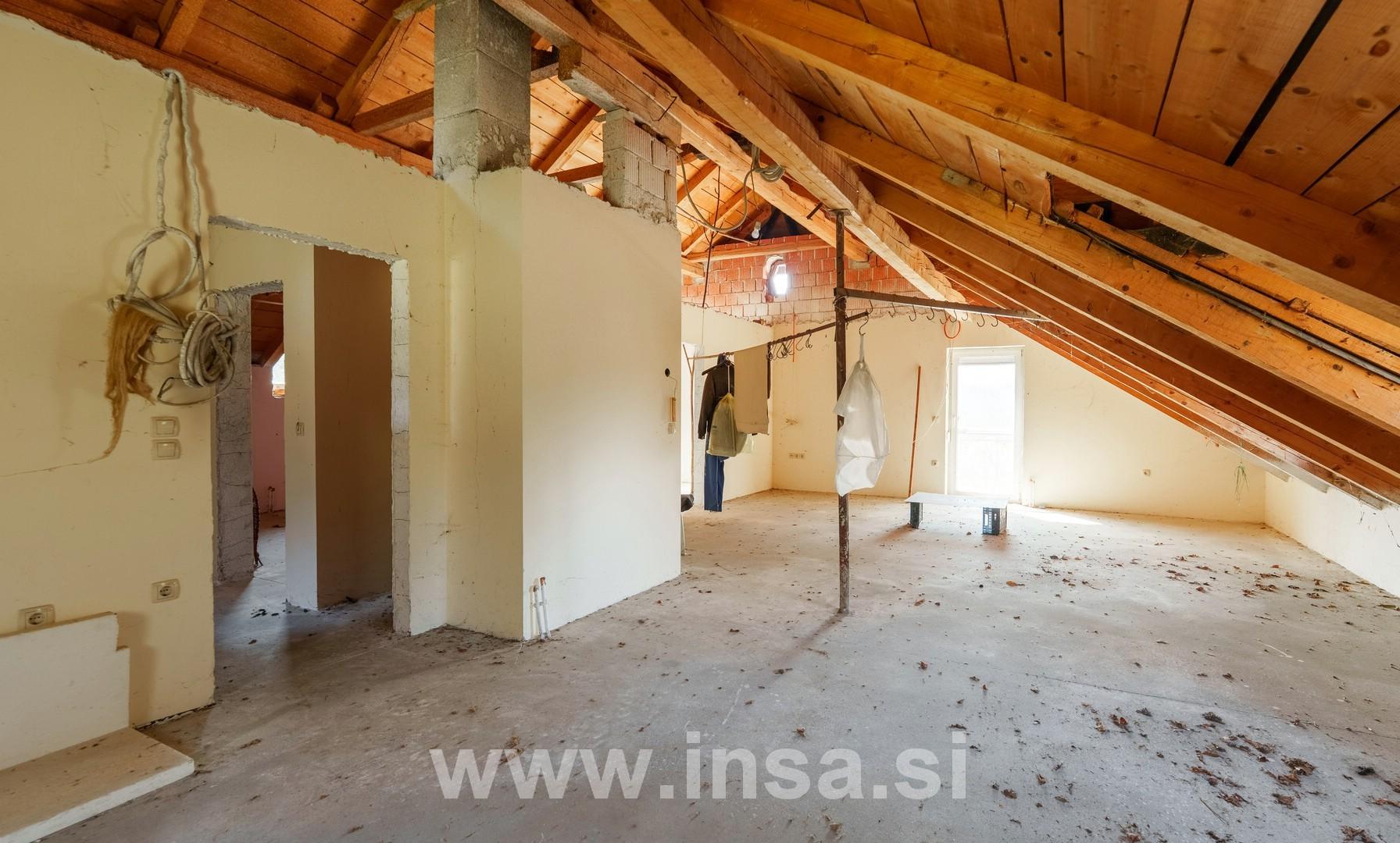 Mansarda je neizdelana in omogoča ureditev dodatnih bivalnih površin. Izdelani so estrihi in urejena napeljava za razvod centralnega ogrevanja (grobi razvod elektrike in instalacija za priklop vode)