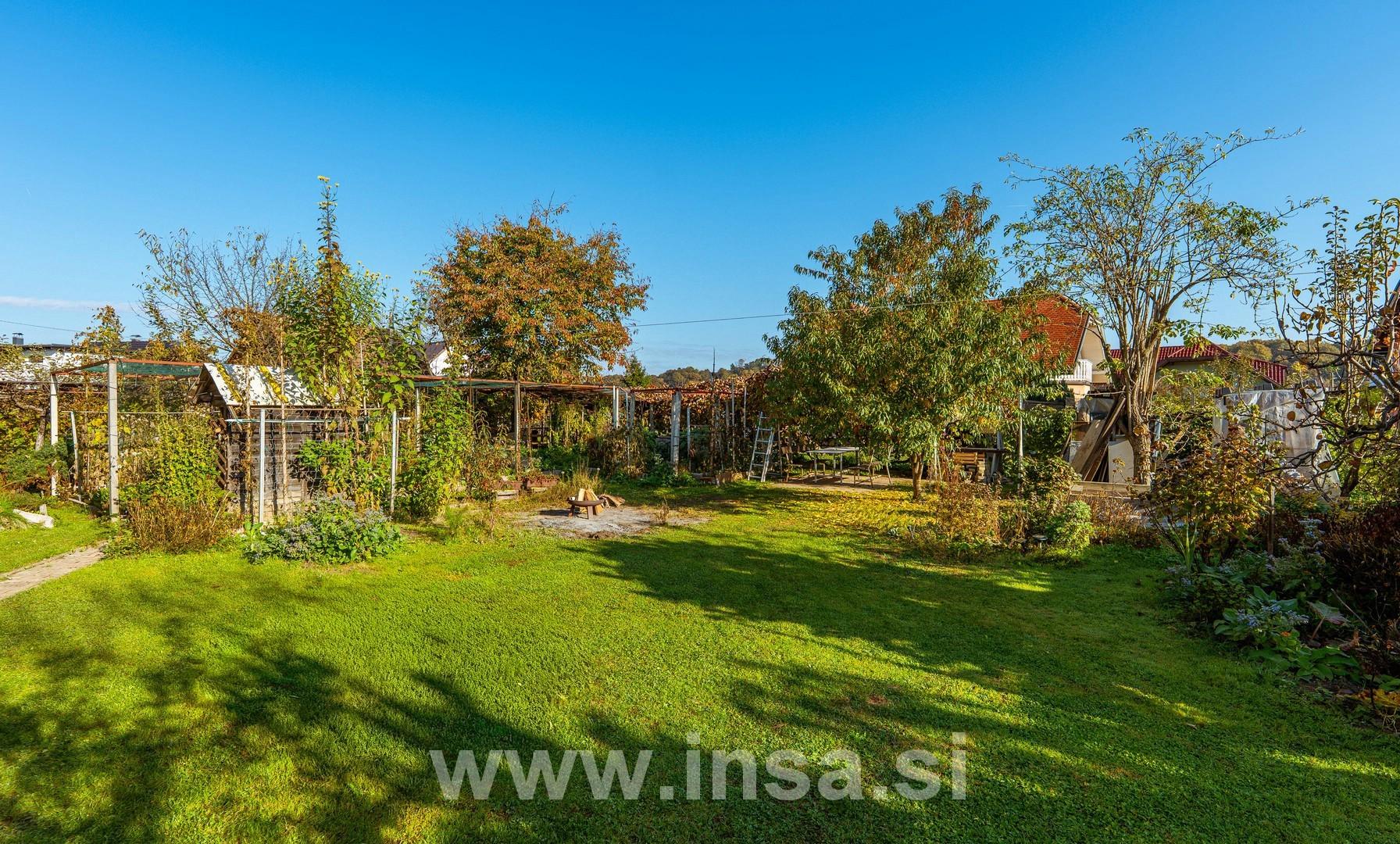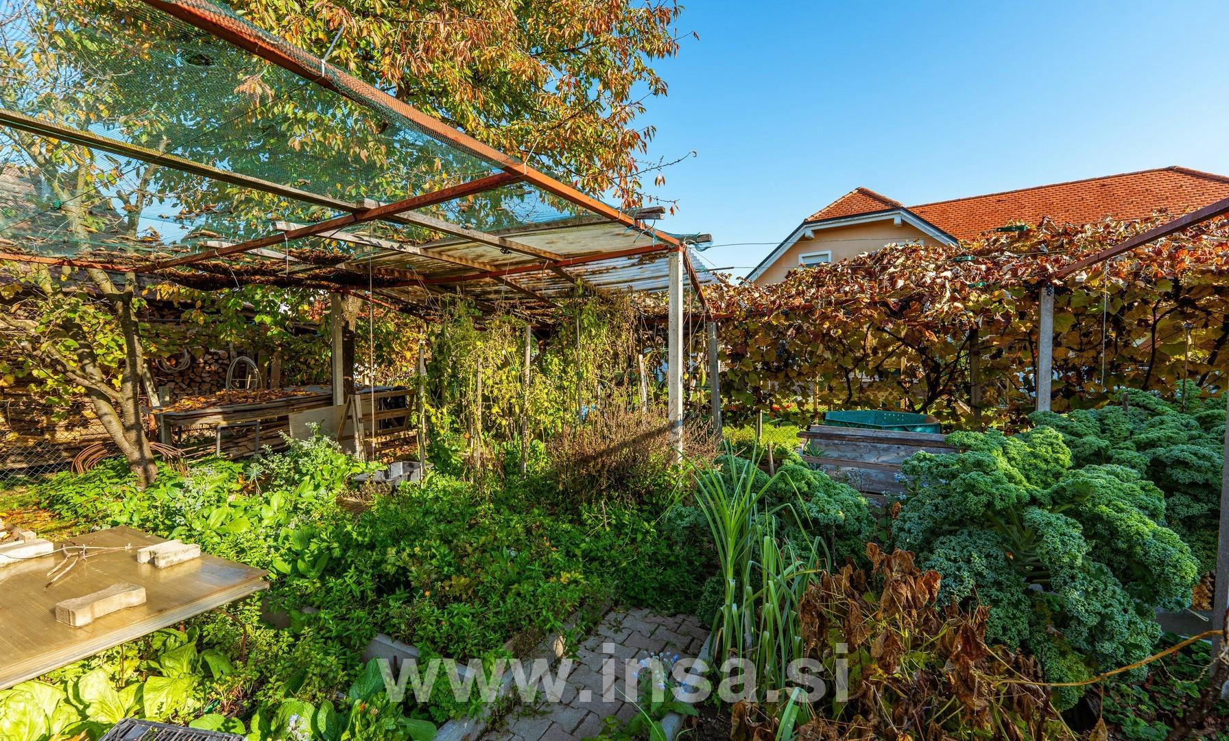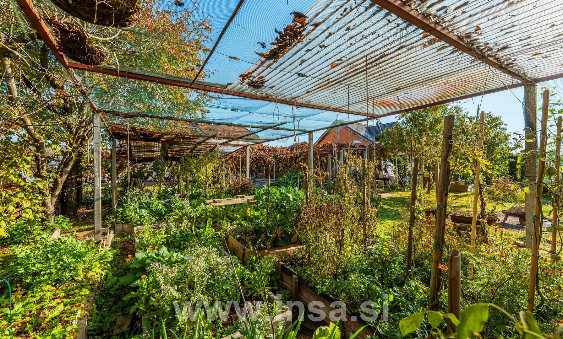 Obsega velik zelenjavni vrt, urejeno zelenico, ki je delno posajena s sadnim drevjem. Celotno zemljišče je ograjeno.