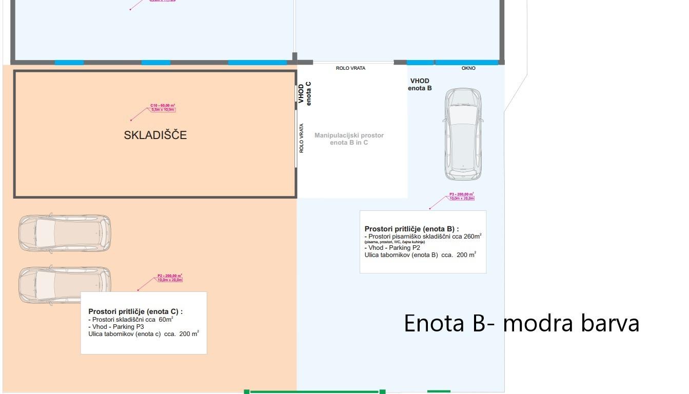 Oddamo del sodobne poslovne stavbe – enota B – pisarne, proizvodni oz. produkcijski in skladiščni del v pritličju, s pripadajočimi parkirnimi prostori.