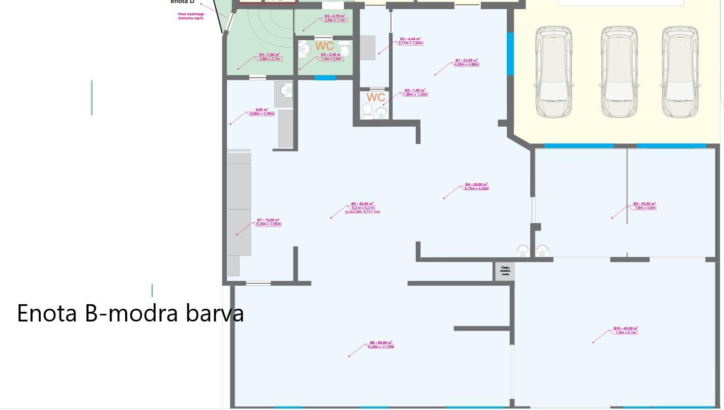 Del stavbe A zajema pisarniške prostore v pritličju s sanitarijami, v izmeri 81 m2, del stavbe C zajema zunanje montažno skladišče v izmeri 60 m2, del stavbe D zajema pisarniške prostore v prvem nadstropju s pripadajočimi sanitarijami in teraso v izmeri 123 m2 + terasa 50 m2. Vse štiri enote imajo ločene vhode in zagotovljene parkirne prostore.
