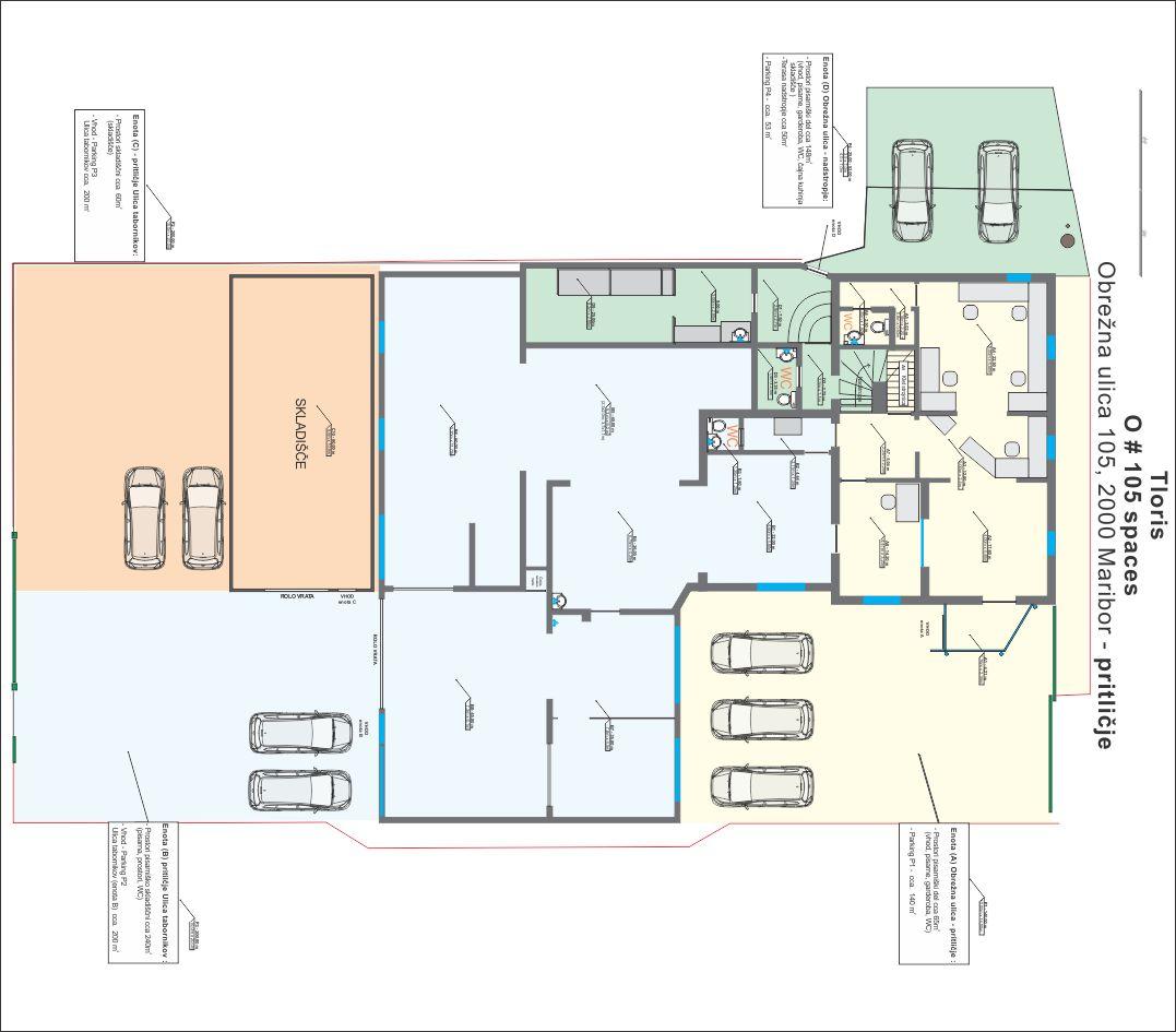 Del stavbe A zajema pisarniške prostore v pritličju s sanitarijami, v izmeri 81 m2, del stavbe C zajema zunanje montažno skladišče v izmeri 60 m2, del stavbe D zajema pisarniške prostore v prvem nadstropju s pripadajočimi sanitarijami in teraso v izmeri 123 m2 + terasa 50 m2. K tej enoti pripada še opremljena čajna kuhinja in skladiščni prostor v pritličju. Vse štiri enote imajo ločene vhode in zagotovljene parkirne prostore.