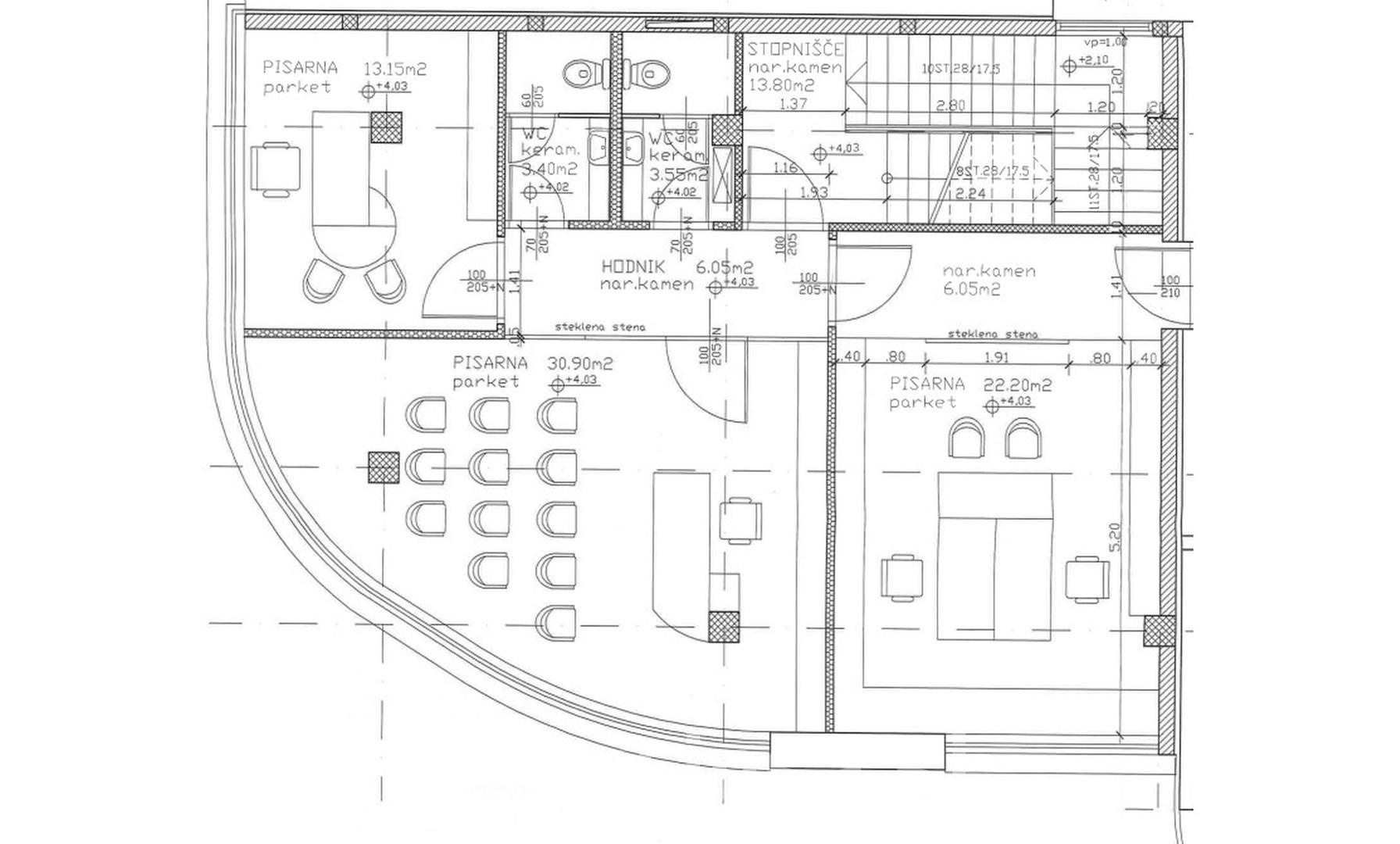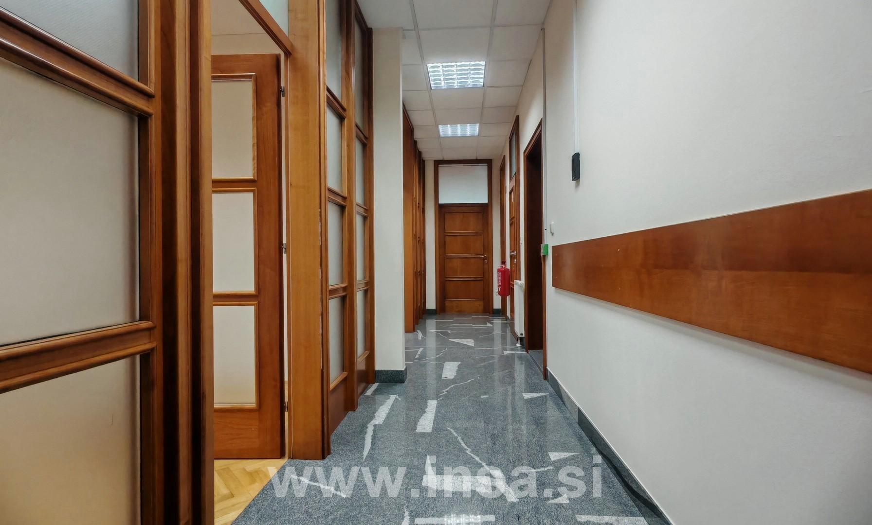 Poslovni prostor obsega tri ločene pisarne, dvojne sanitarije (ločene moške in ženske) ter hodnik. Pisarne so velikosti 13, 22 in 31 m2.