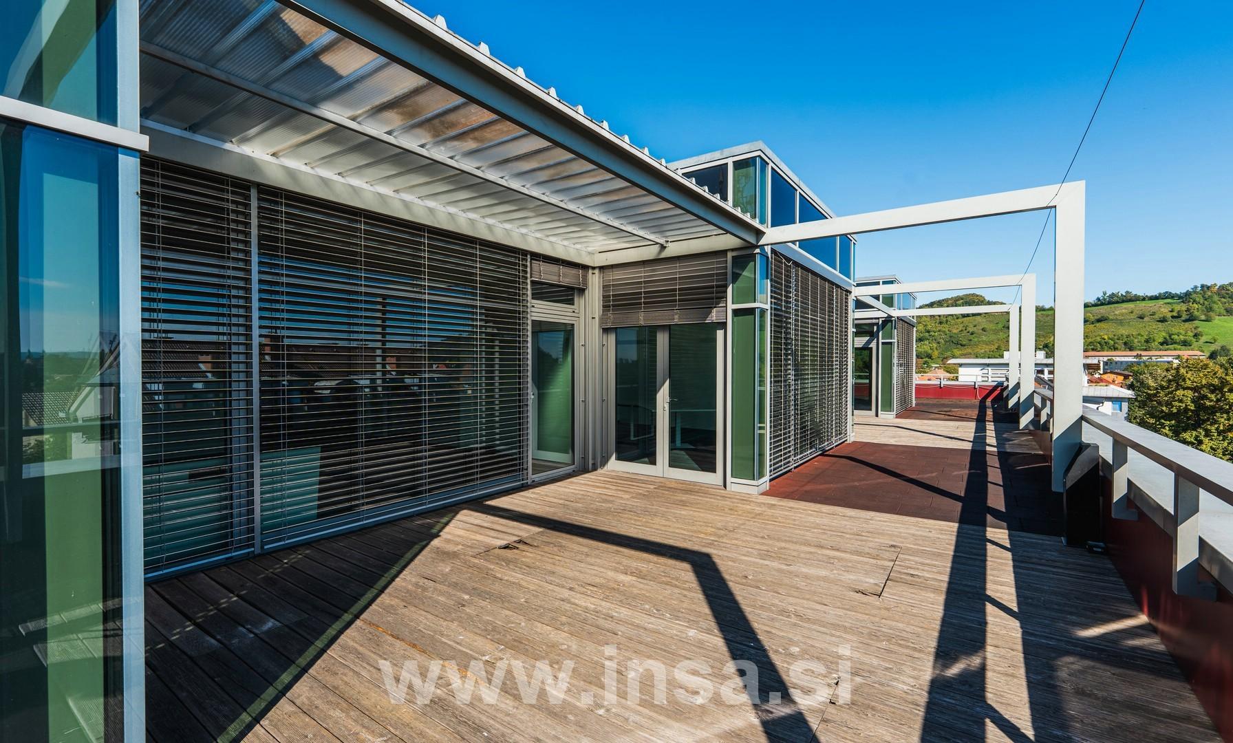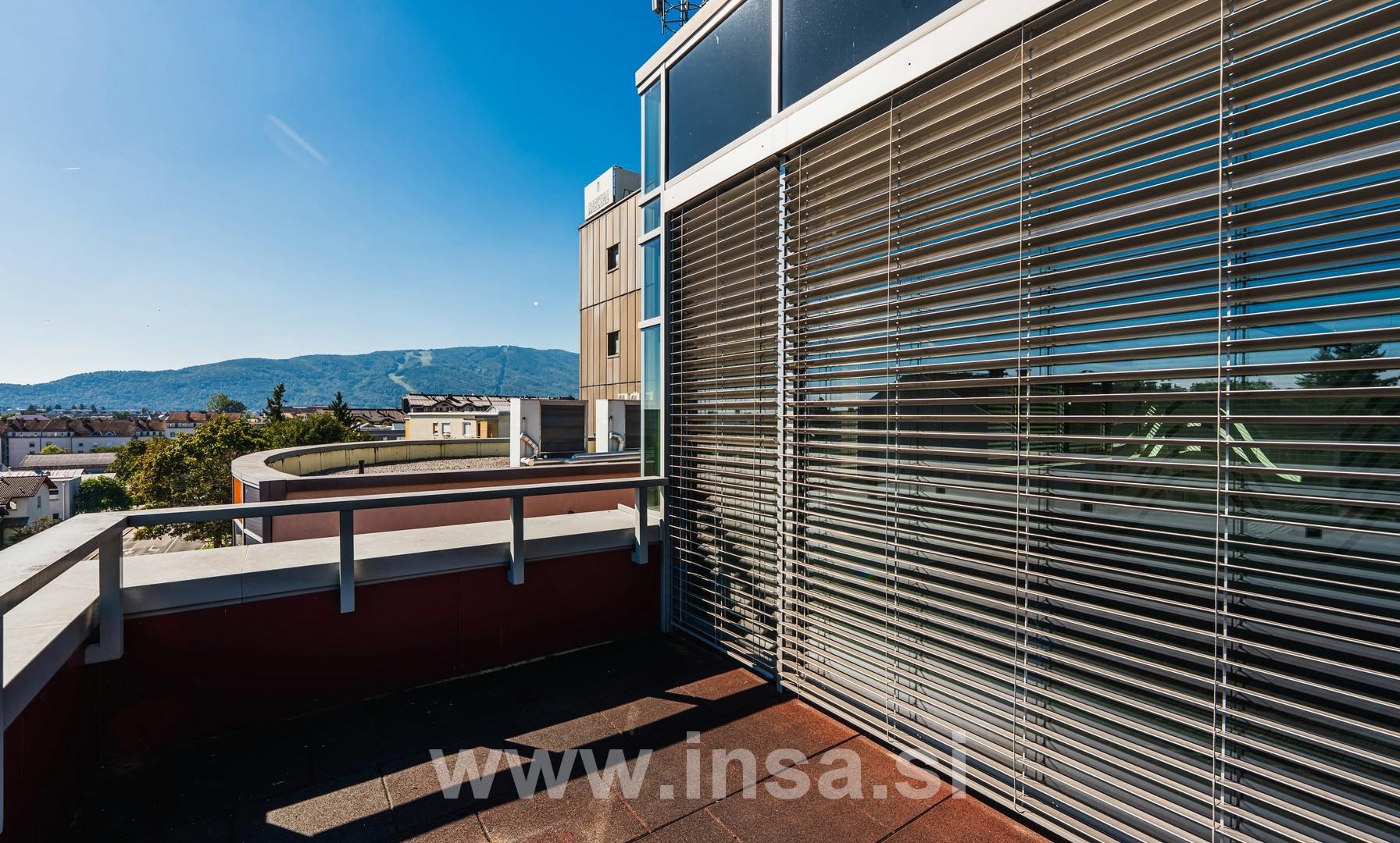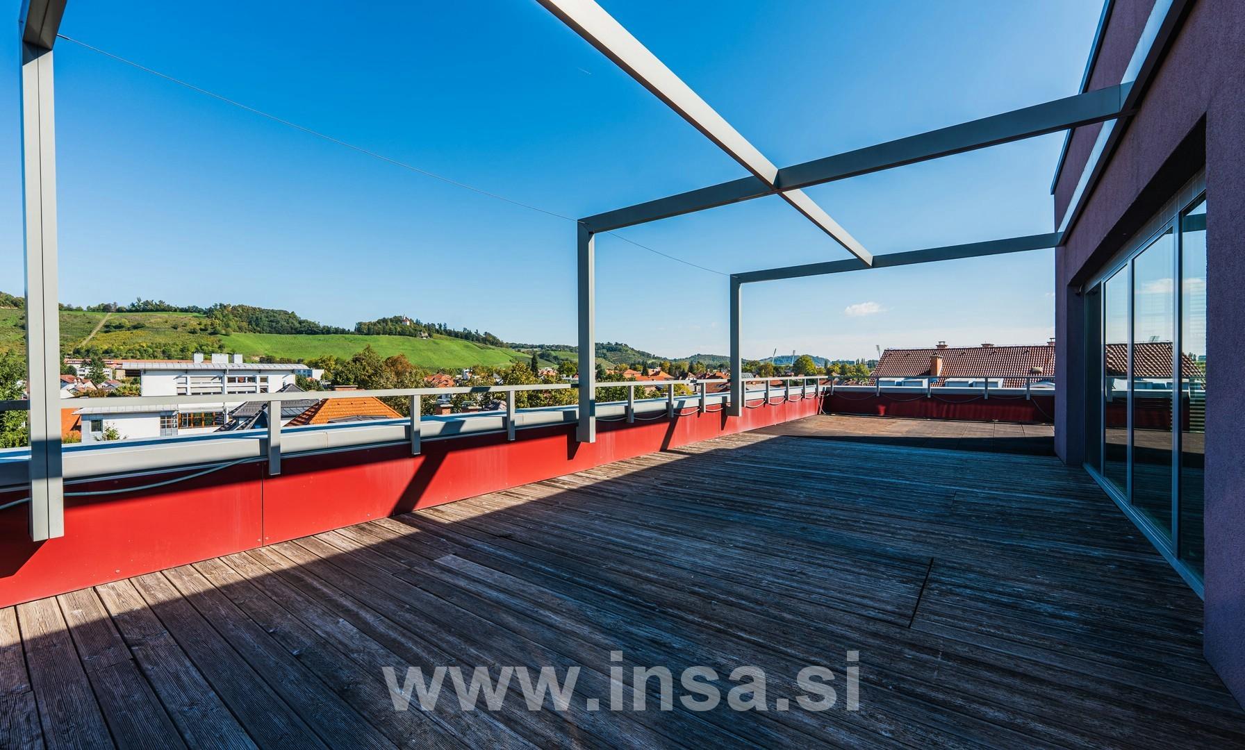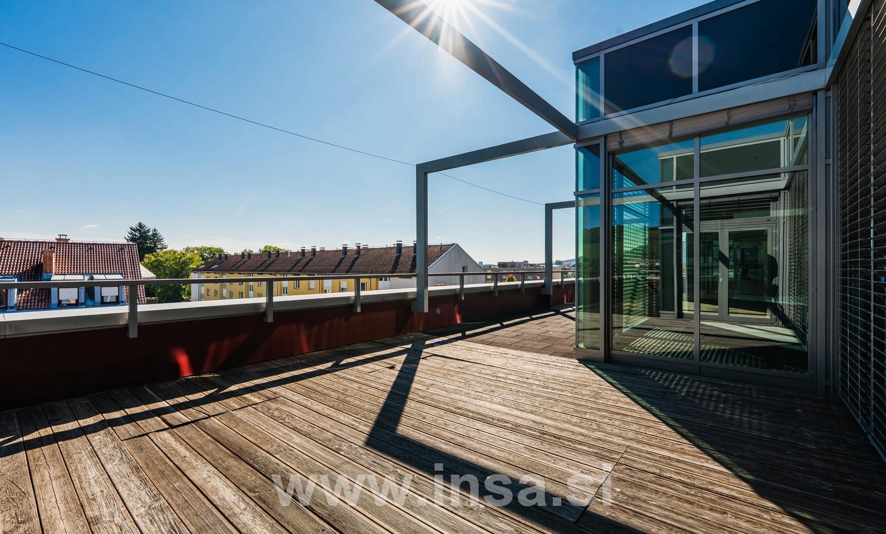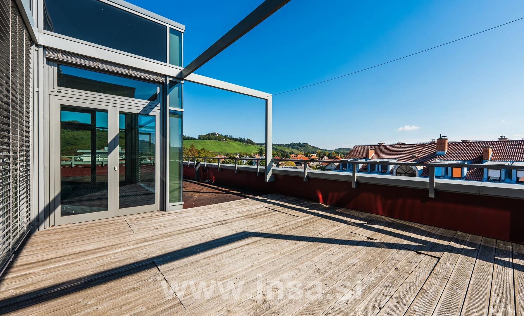 Pravi biser tega prostora pa je kar 187 kvadratnih metrov velika terasa, prava oaza miru in inspiracije visoko nad vrvežem mesta. Je Idealen prostor za klepet ob kavi, kot tudi za kreativno ali rekreativno razbremenitev.