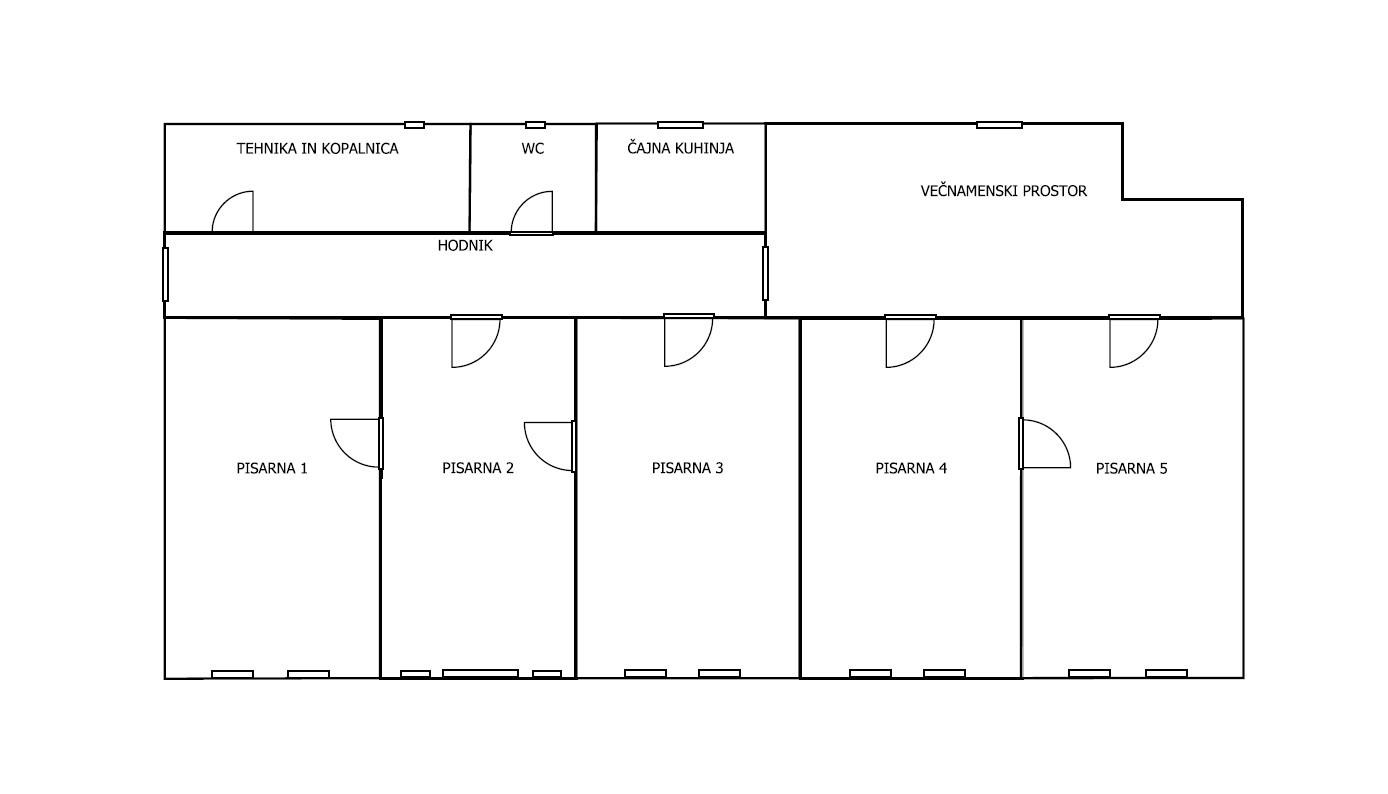 Poslovni prostor obsega pet pisarn (štiri površine 24 m2 in ena površine 18 m2), dodatni prostor površine 20 m2, ki lahko služi kot sprejemnica ali prostor za arhiv, mini čajno kuhinjo, ločen wc, mini kopalnico s tuš kabino (kjer je dodatni wc) ter tehnični prostor. Pisarne so med seboj povezane, vse, razen ene pa imajo svoja vhodna vrata, tako, da se lahko uporabljajo tudi ločeno. Iz ene od pisarn, je tudi izhod na majhen balkon.