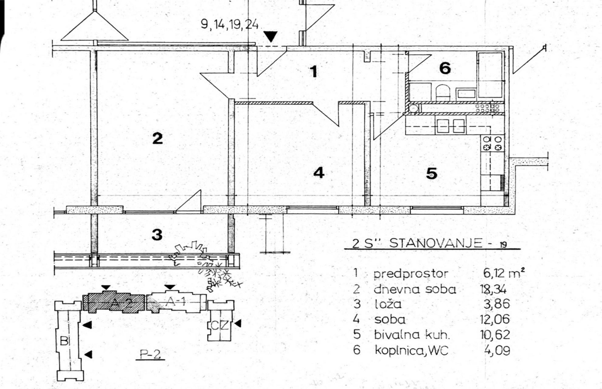 Stanovanje se nahaja v 2. nadstropju večstanovanjskega bloka, zgrajenega leta 1977, z obnovljeno streho in fasado.
