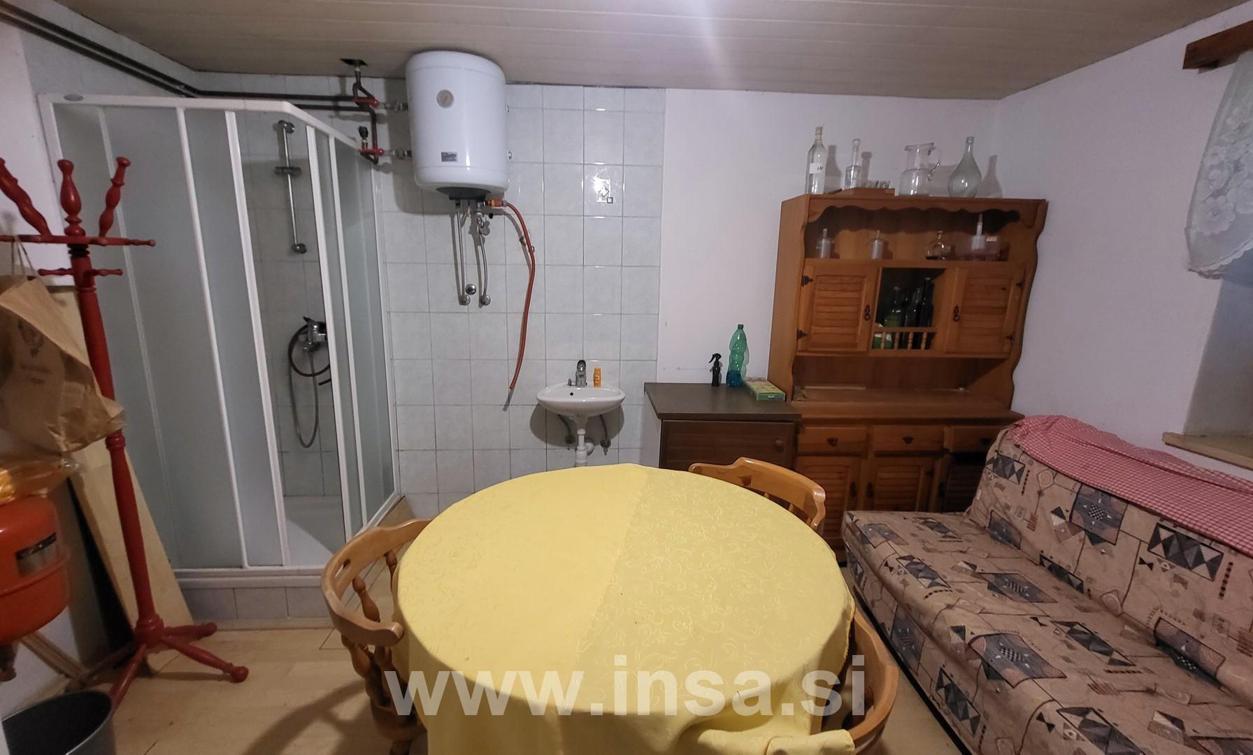 V naravi obsega; prostor za druženje, kuhinjo in sobo z urejenim tušem. Ob vhodu je večja pokrita terasa, dostop do kleti in wc z zunanje strani, na podstrešju je mogoče urediti dodaten prostor.
